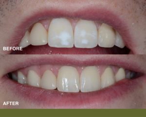 Resin infiltration is a minimally invasive restorative treatment for post-ortho white-spot lesions and certain congenital hypocalcified enamel lesions. White Spot lesions are associated with subsurface enamel porosities caused by a cyclical imbalance between demineralization and remineralization of the enamel, resulting from poor hygiene and associated plaque, bacteria and acids. With time, reminerlization at the outer surface of the tooth decreases the access of calcium and other ions to deeper portions of the enamel, eventually arresting the lesion. The lesions look white because there is a scattering of light at the subsurface of the demineralized enamel.