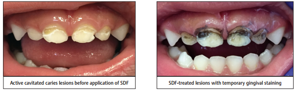 Note: SDF permanently stains cavities black. SDF requires repeat application during recall appointments for maximum efficacy. SDF can not be used in the presence of infection or decay into the nerve.